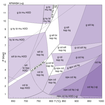 The concept of a phase diagram at constrained bulk composition is thanks to Bas Hensen. This diagram is given various names in the literature. Here we use the term pseudosection to refer to such diagrams, plotted in P-T, P-X or T-X space. The term pseudosection is intended in the sense of a pseudobinary – the compositions of the phases lie in general outside the plane of the section.