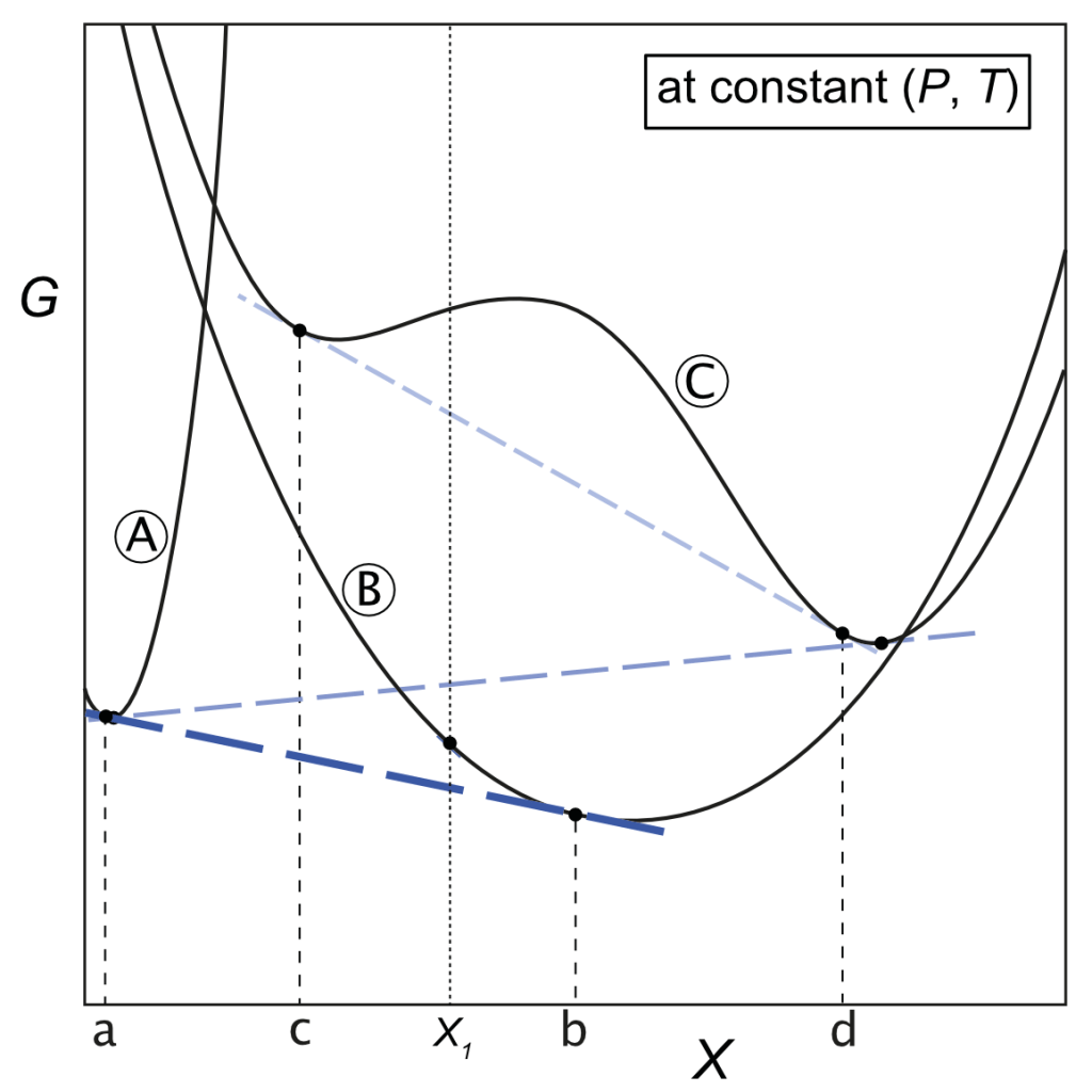 Figure 1: Construction of phase equilibria in G-X (Gibbs free energy – composition) space at constant pressure and temperature (P,T). The figure shows G-X loops for phases A, B and C (phase C exhibits a solvus at intermediate compositions). Blue dashed common tangents indicate equilibria between phases that could be mass-balanced at bulk composition X1; black dots indicate equilibrium compositions. The most stable assemblage that could form in rock X1 is coexisting phase A with composition a and phase B with composition b (dark blue tangent). The next most stable assemblage is pure phase B with composition X1, followed by coexisting A and C (mid-blue tangent), followed by two coexisting phases of C’s structure and compositions c and d (light blue tangent). The HPx-eos of a phase provides its G-X loop.