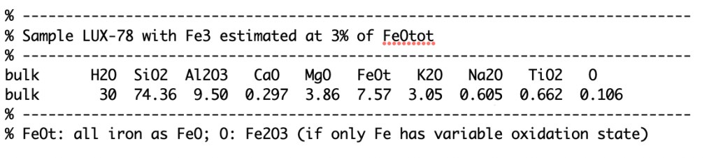 To calculate a pseudosection you must set a bulk composition. This is usually done using the bulk script (formerly setbulk), as shown below, with the proportions of oxides given on a molar basis (“%” indicates comment not read by program):